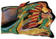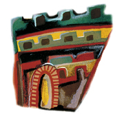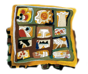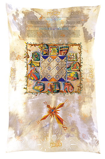 The twelve ancient tribes of Israel symbolizes the unity of individuals coming together as one. From each individual tribe a new family was born. The images in the ketubah are very tribal, and within you can see African figures holding horns (shofar), dancing and tribal geometric shapes from corner to corner. The feel of earth, wind and the tribes spread through out the land of Israel and is expressed within the compass at the bottom, and at each side of the ketubah: North-Tzafona. West-Yama. East-Kedma. South-Negba. In the bacground, old artifacts from early ages, such as the Menorah, an old cup, and Chamsa, barley and wheat symbolizes luck and wealth . The mosaic around the the symbols of the 12 tribes was inspired by an ancient synagogue in Beit Alfa, Israel that was discovered in 1929 by archaeologists from the Hebrew University. The synagogue, measuring 46 x 92 feet, included a courtyard, hall, two side aisles and a women's gallery.It faced south toward Jerusalem. A small cavity in the floor served as a genizah; above it was an Ark for the scrolls of the Law. The whole floor of the building is inscribed with mosaics.
